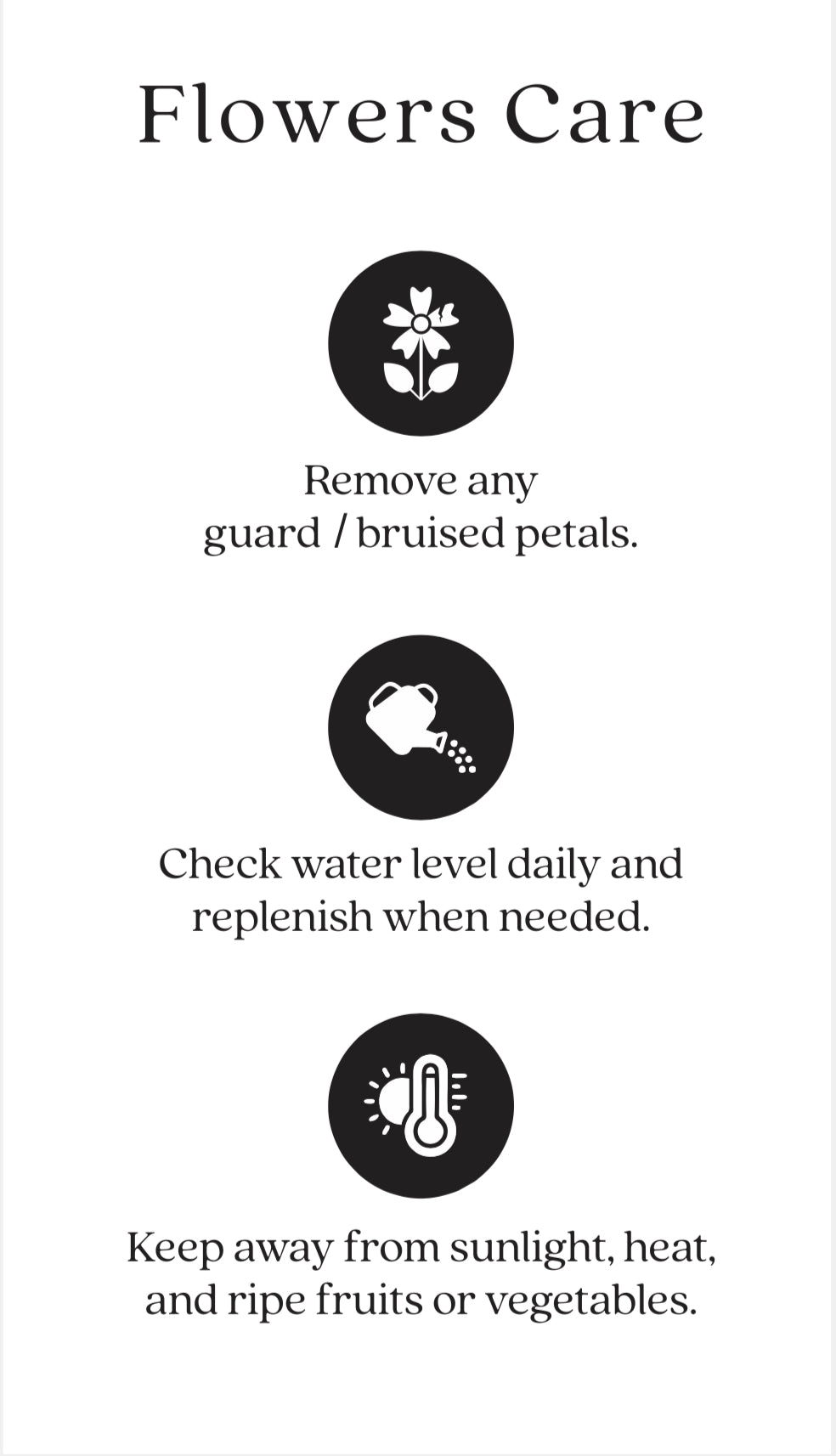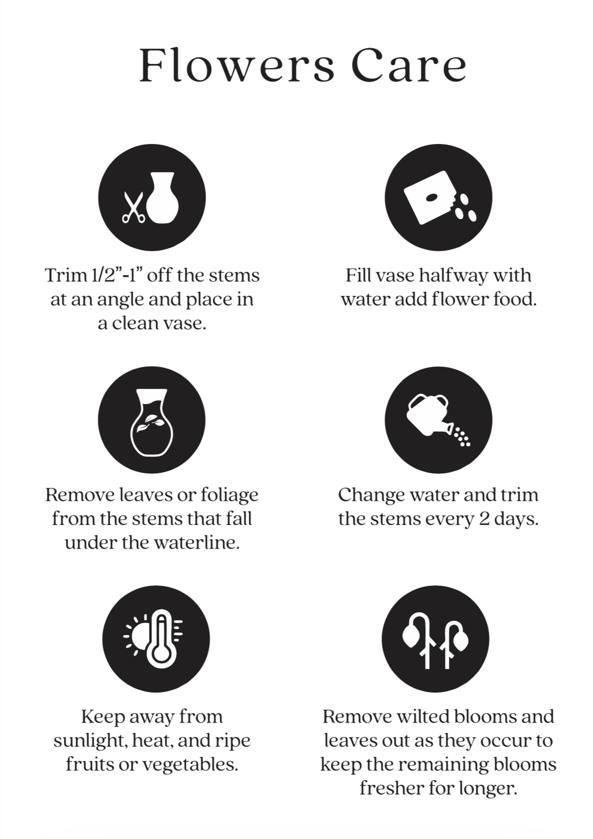 This is the care instruction for hand wrap bouquets and flower vases that contain NO green oasis foams. TEXT US FOR ANY QUESTIONS 714-949-8500.