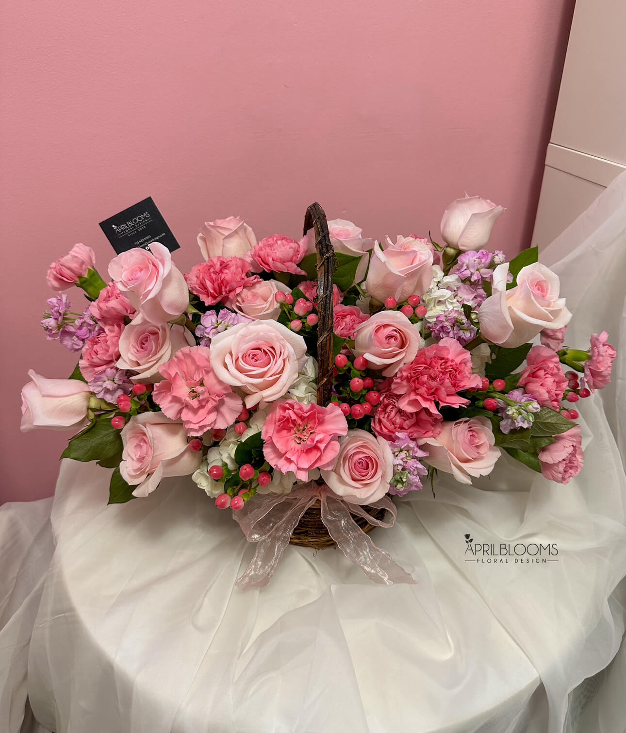 Roses, carnations, stocks, hypericums and greeneries in a basket.