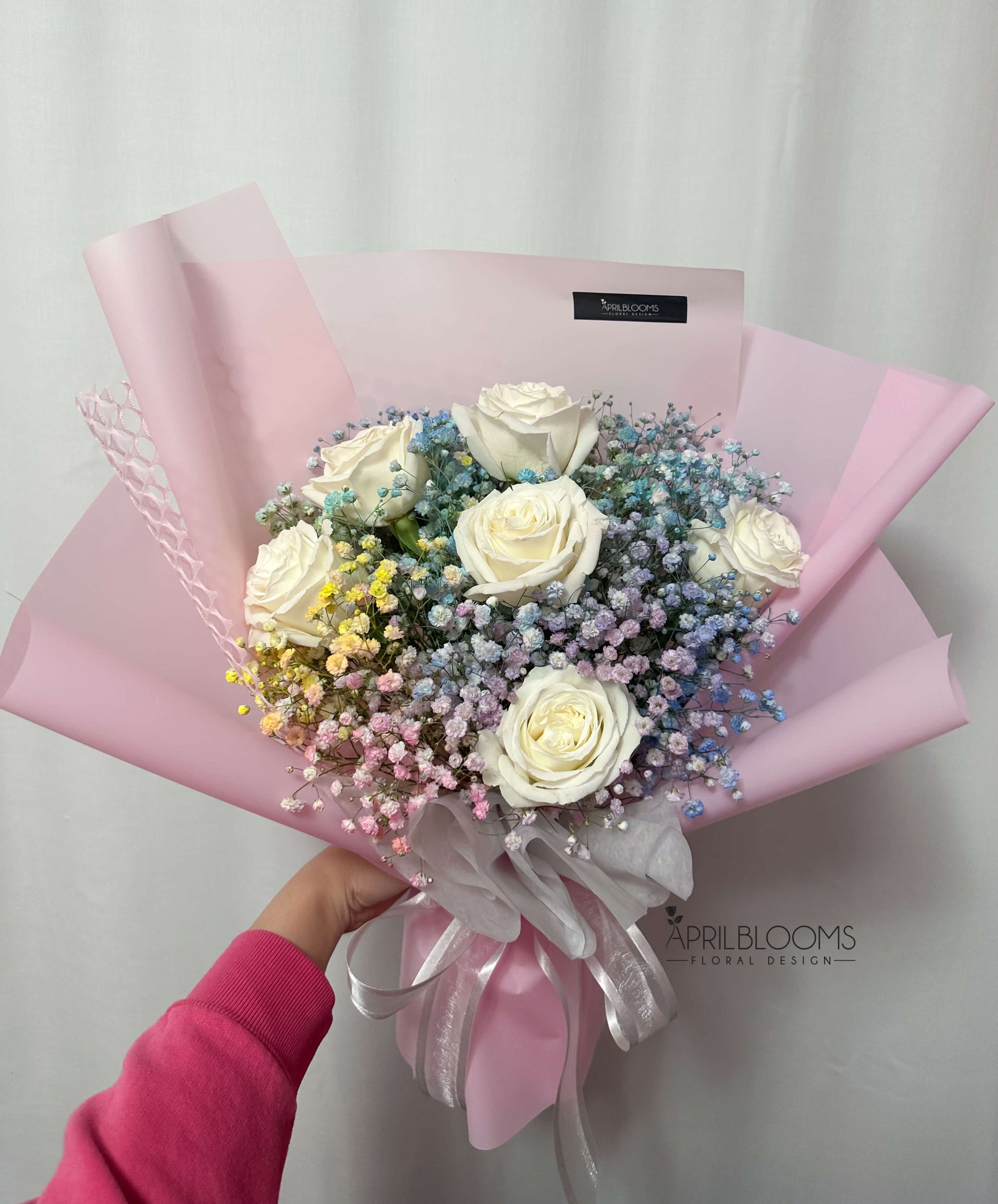 Rainbow baby's breath and 6 roses wrapped in pink mesh and pink waterproof paper.