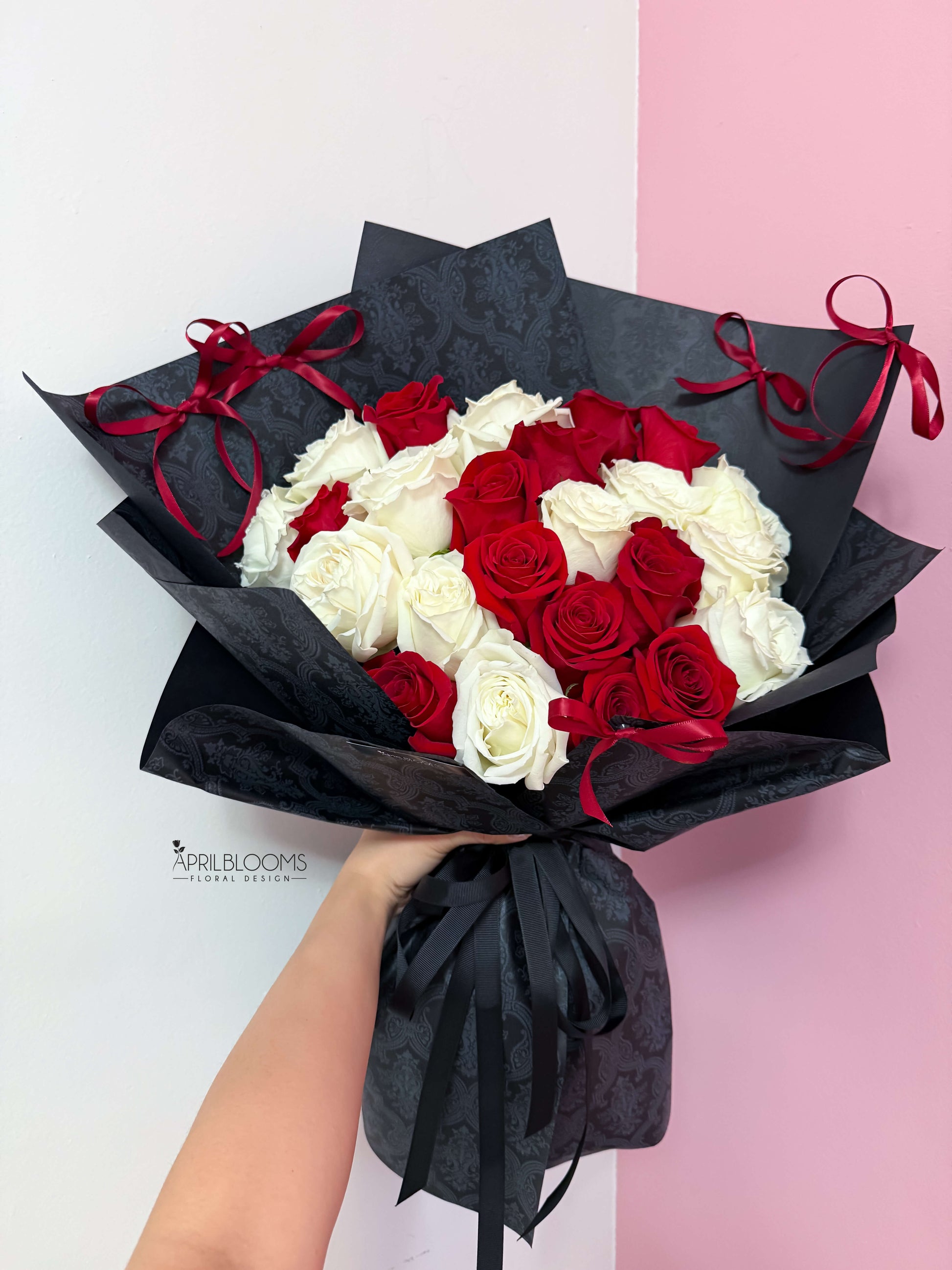 2 dozens roses wrapped in black deluxe vintage kraft papers.