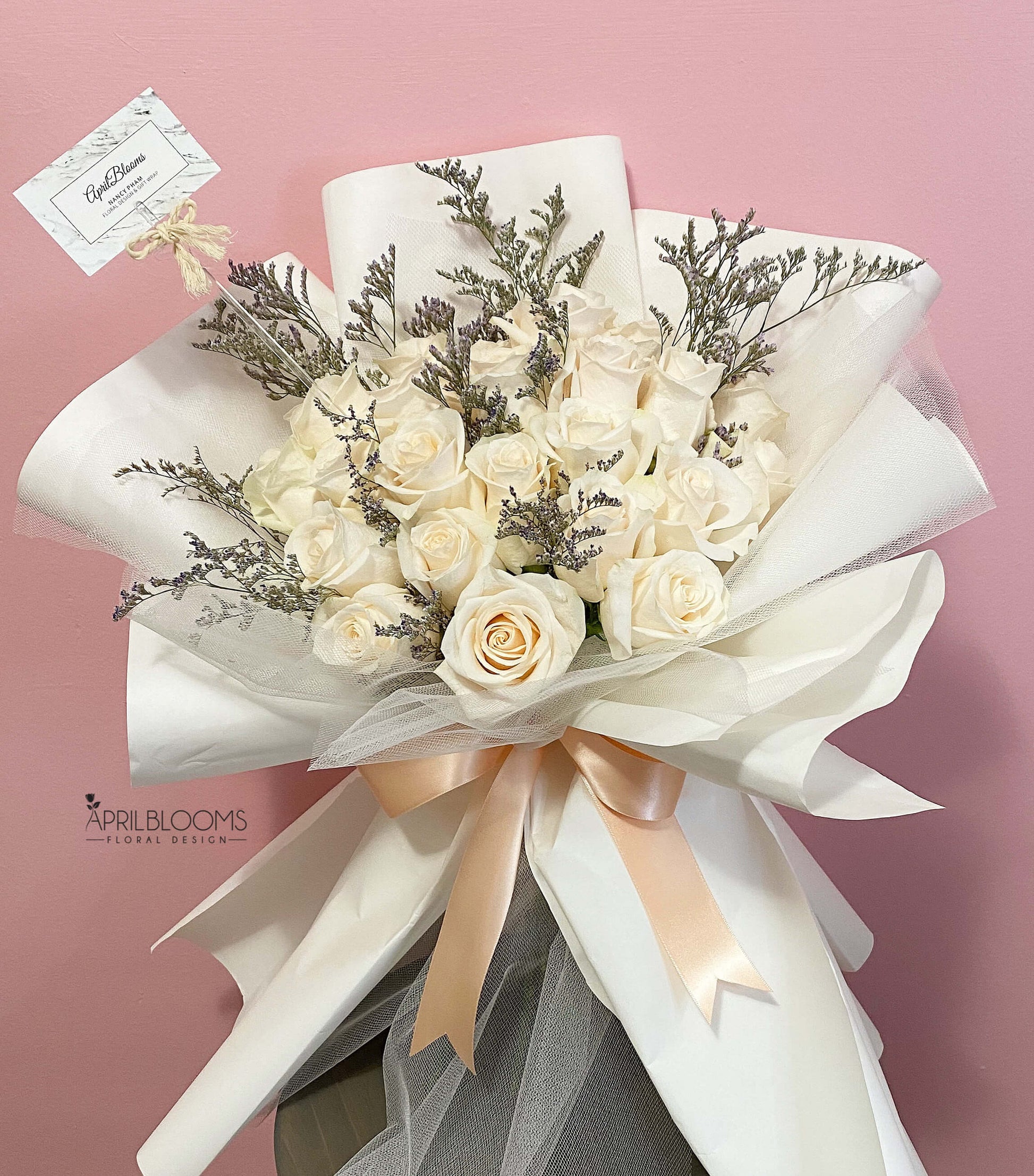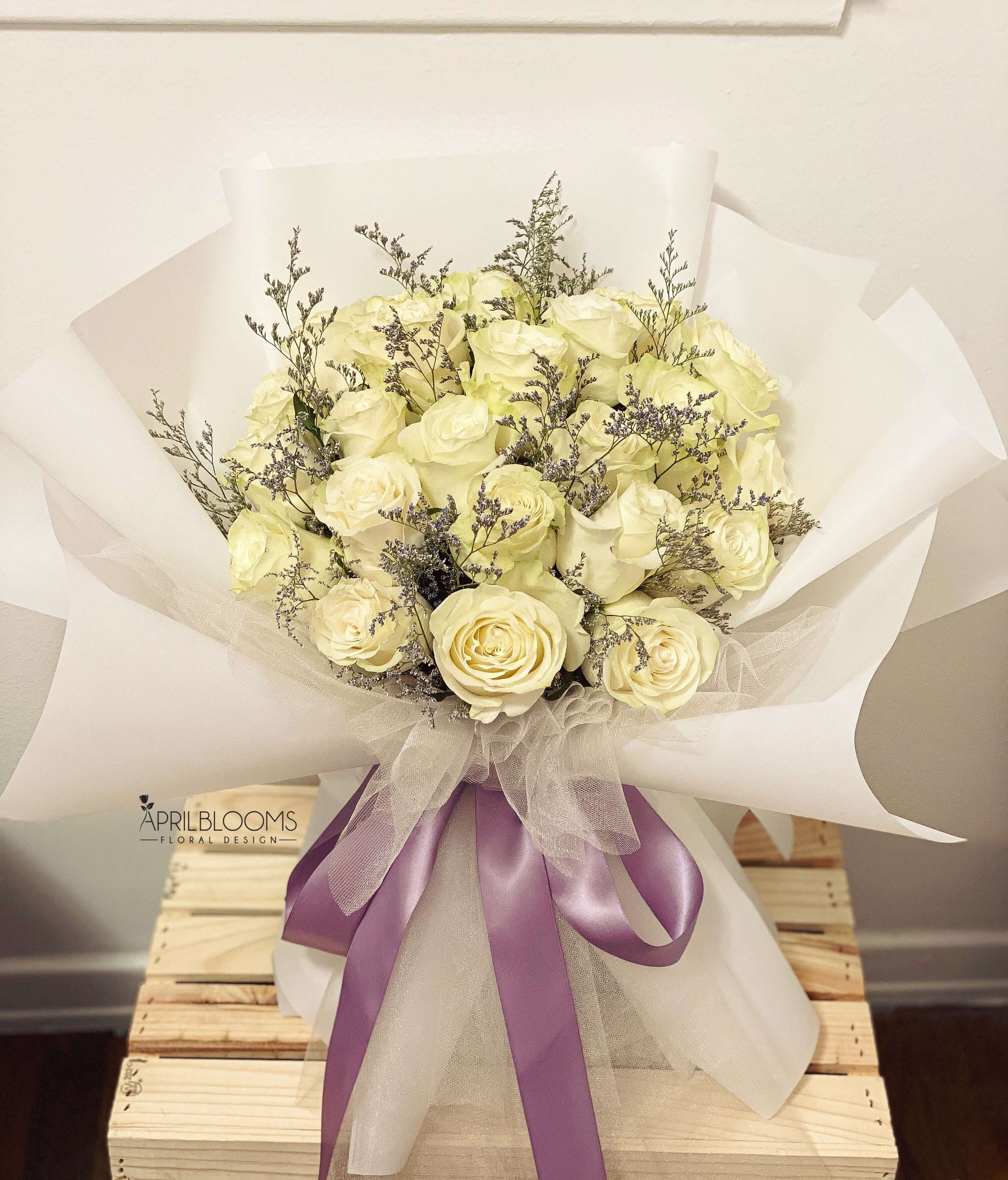 2 dozens of white roses and purple misty wrapped in white waterproof and lace papers.