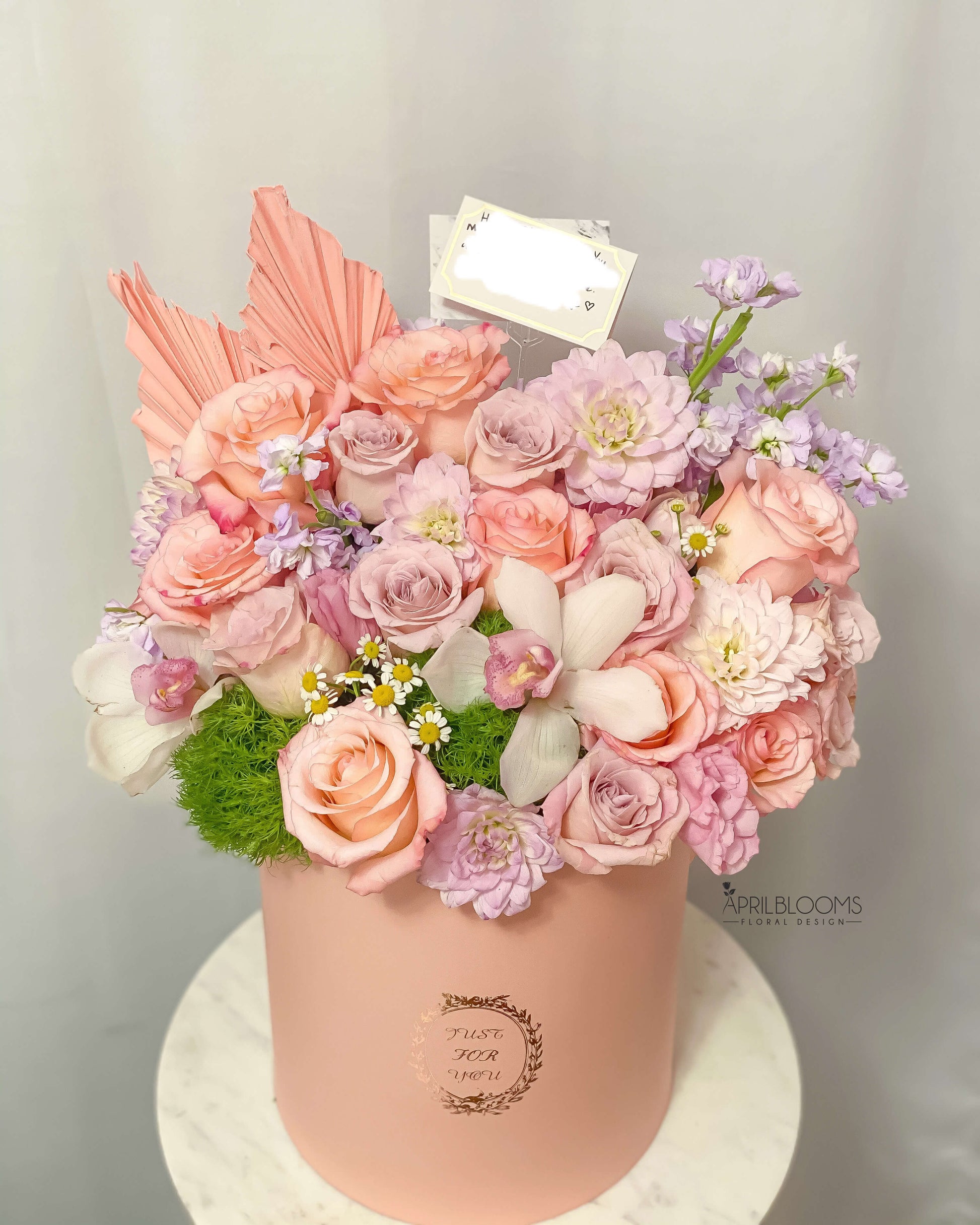 Roses, stocks, dianthus, dahlias, cymbidium, chamomiles, lisianthus, palm fans in pink box.