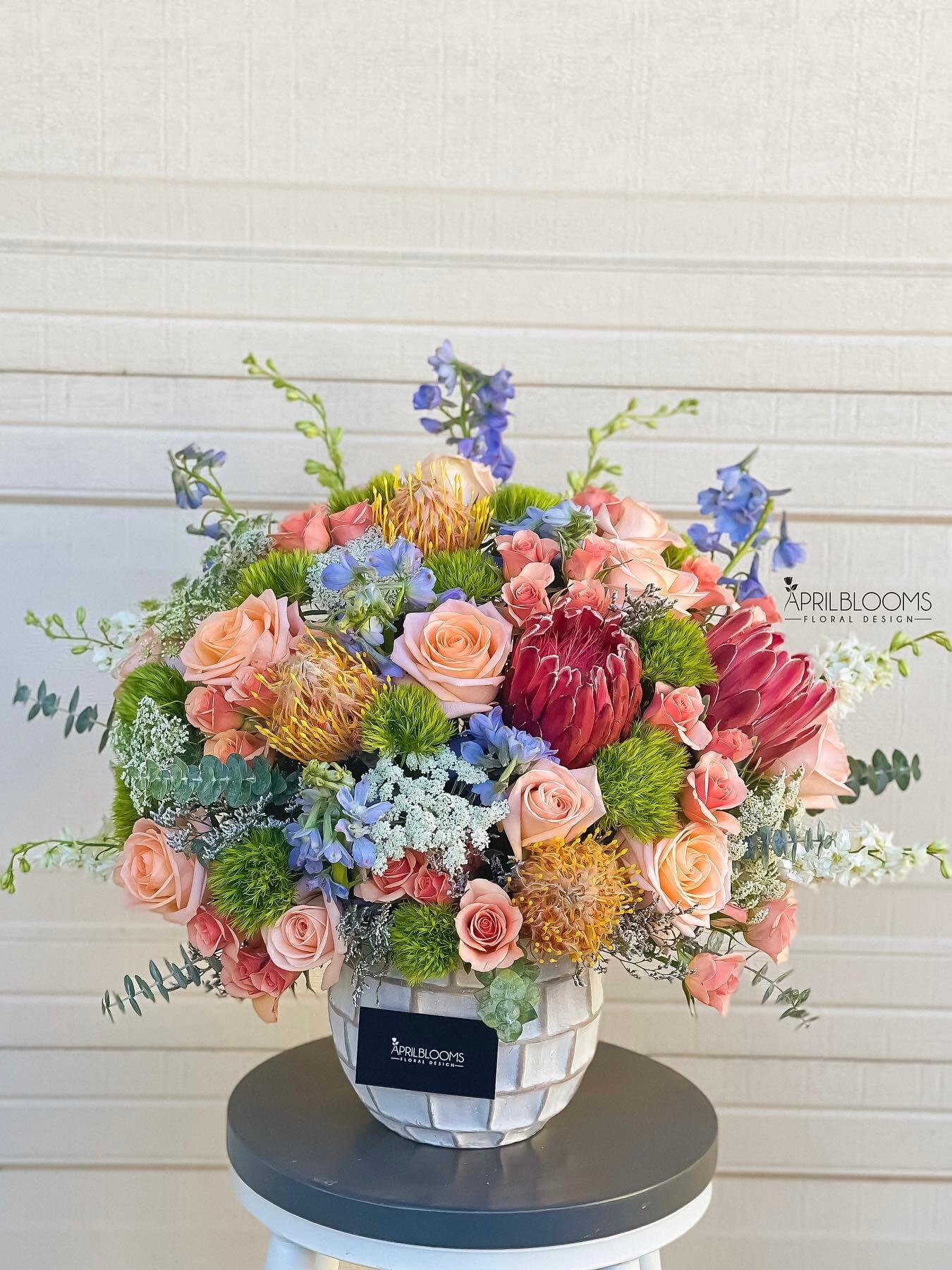 Roses, Spray Roses, Proteas, Delphiniums, Queen Anne's Lace, and etc. in concrete vase.