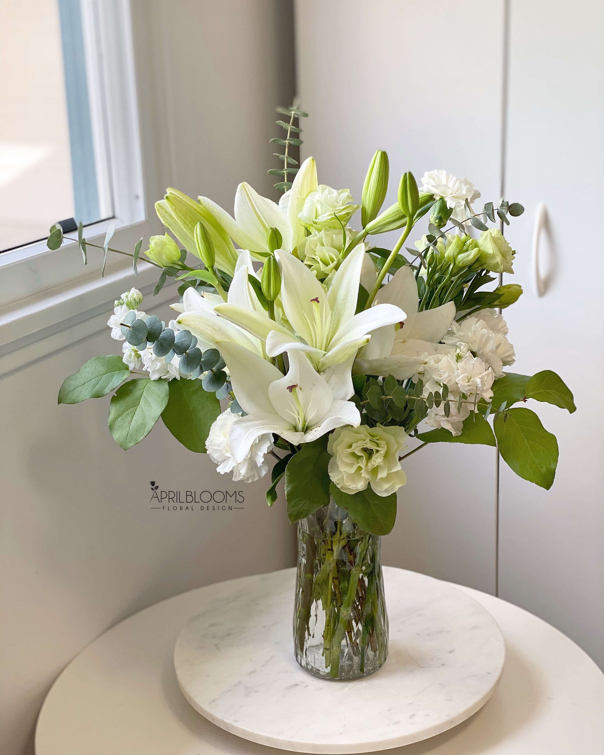 Lilies, carnations, lisianthus, stocks, eucalyptus, lemon leaves in glass vase.