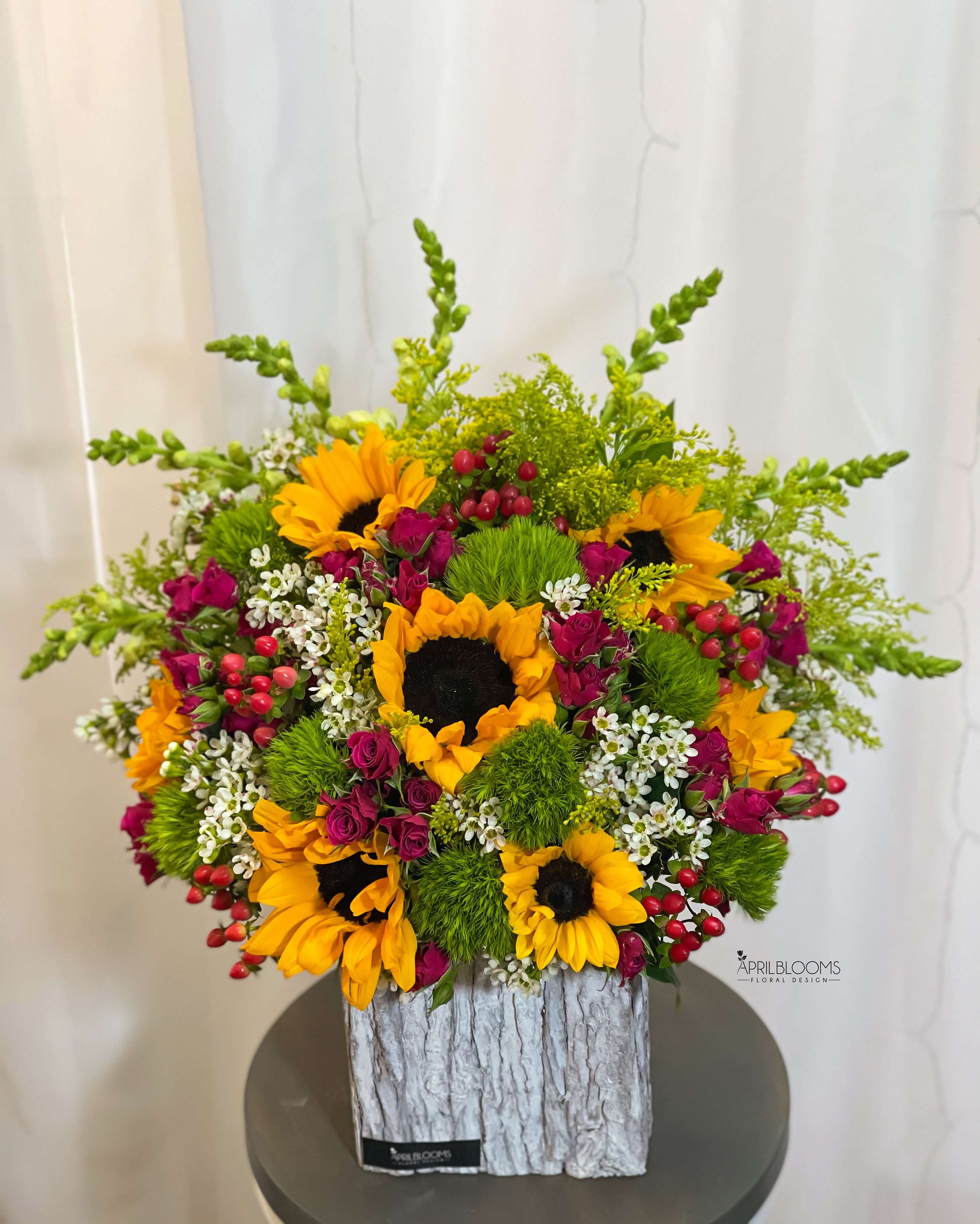 Sunflowers, spray roses, snapdragons, hypericums, wax flowers, solidago, dianthus in wood pot.