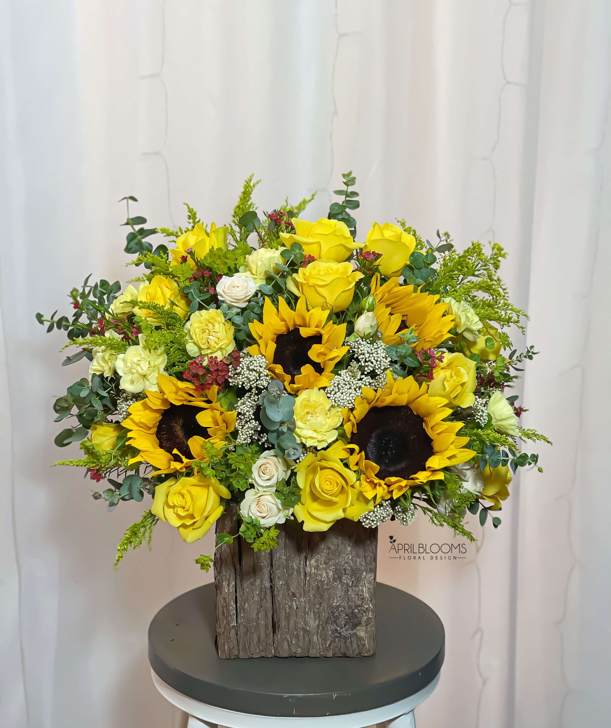 Roses, sunflowers, spray roses, solidago, and fillers in wood pot.