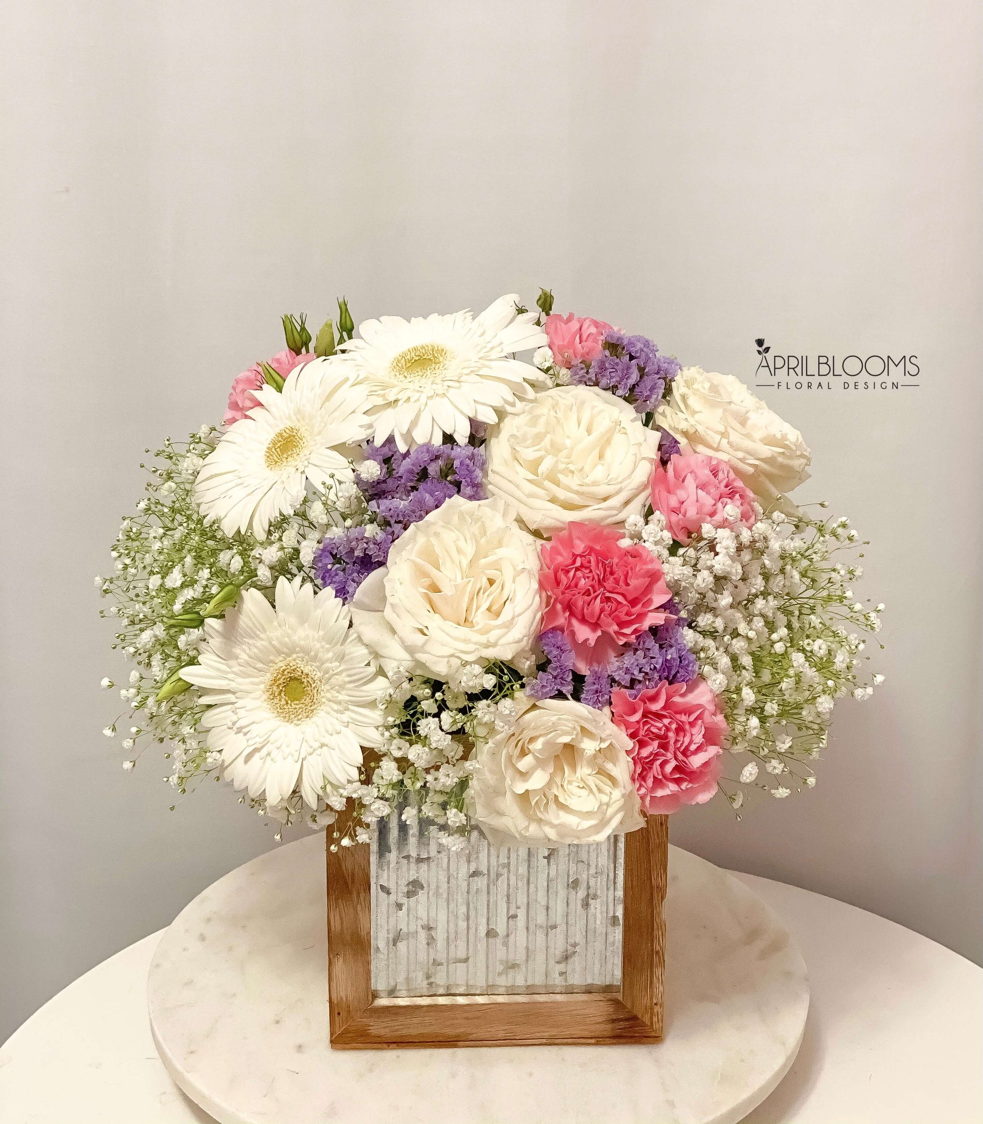 Roses, carnations, gerberas, baby's breath, statice in wood pot.