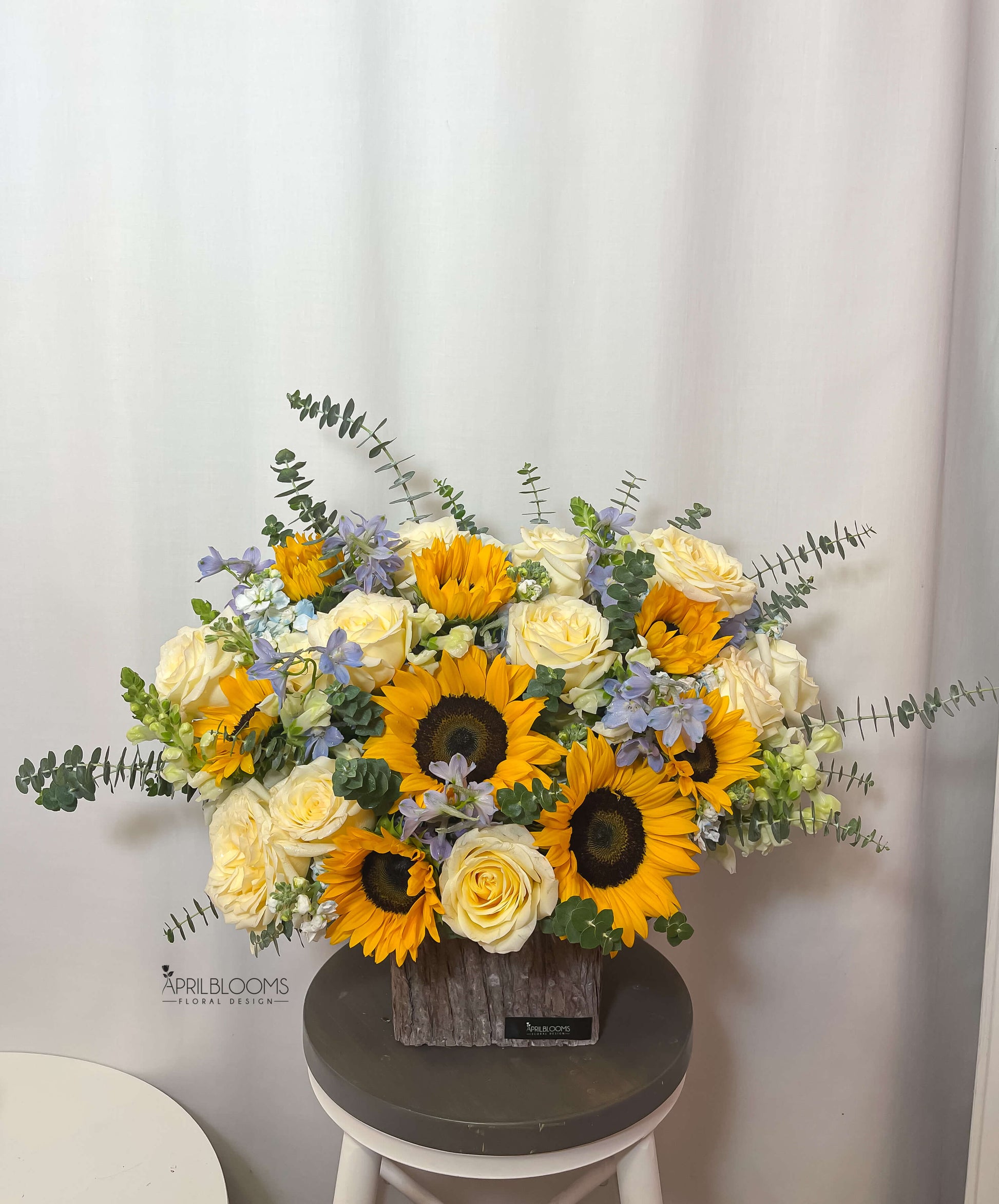 Sunflowers, roses, delphiniums, snapdragons, eucalyptus in wood pot.