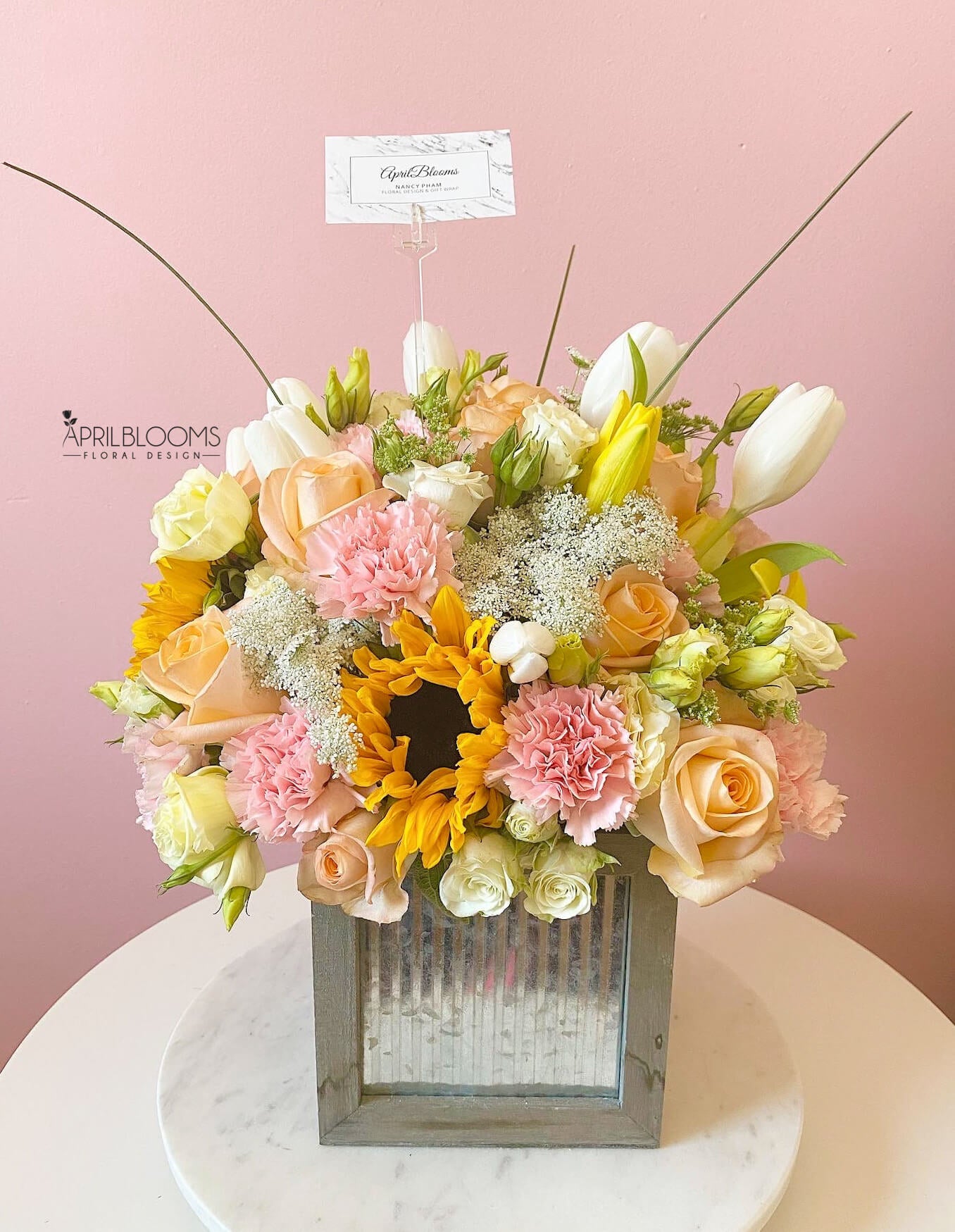Roses, carnations, spray roses, tulips, queen anne's lace, sunflowers, lisianthus in wood pot.